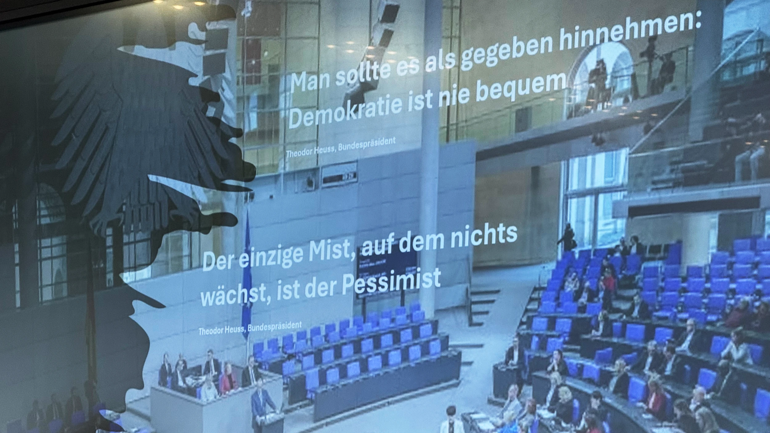 Das Zitat des Namensgebers unserer Schule, Theodor Heuss, stellte der Zeitzeuge Jörg Zenkner in den Mittelpunkt seines Berichts, wie er als Jugendlicher in der DDR in Schwierigkeiten kam und verhaftet wurde, den er am Tag des Erinnerns und Gedenkens, den das Theodor-Heuss-Gymnasium am 28.01.2026 veranstaltete, vor dem 11 Jahrgang hielt.