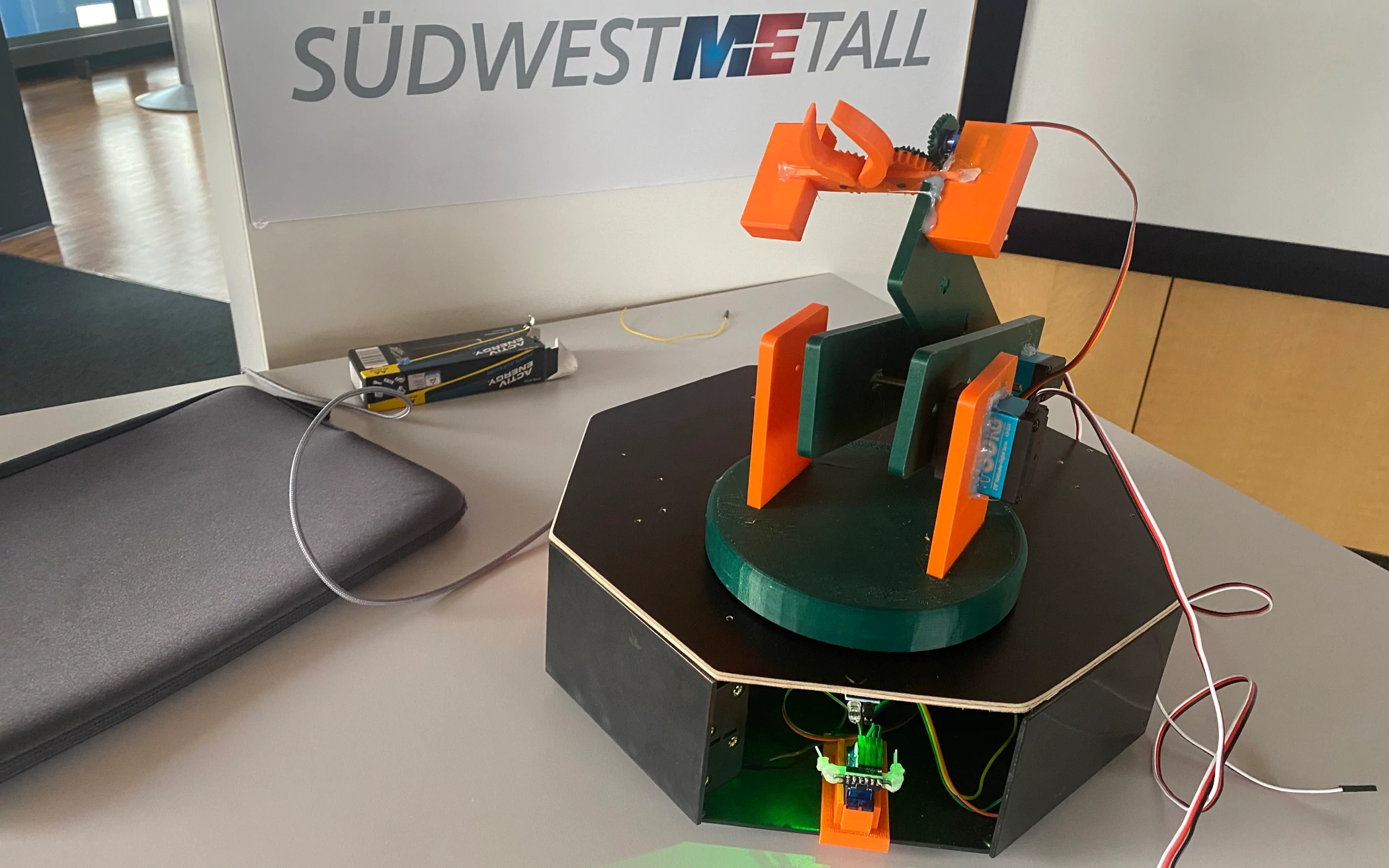 Ein zentraler Bestandteil war erneut die Arbeit mit CAD-Programmen, mit denen die Jugendlichen sämtliche Bauteile selbst konstruierten. Bei einem Treffen im Februar stellten sie ihre Entwürfe den beteiligten Partnerunternehmen vor. Gemeinsam wurde entschieden, welche Elemente wie umgesetzt werden konnten und welche Änderungen erforderlich waren. Parallel arbeiteten die Gruppen weiter an der Elektronik und der Programmierung, um eine zuverlässige Steuerung des Roboters und seines Greifarms zu gewährleisten.