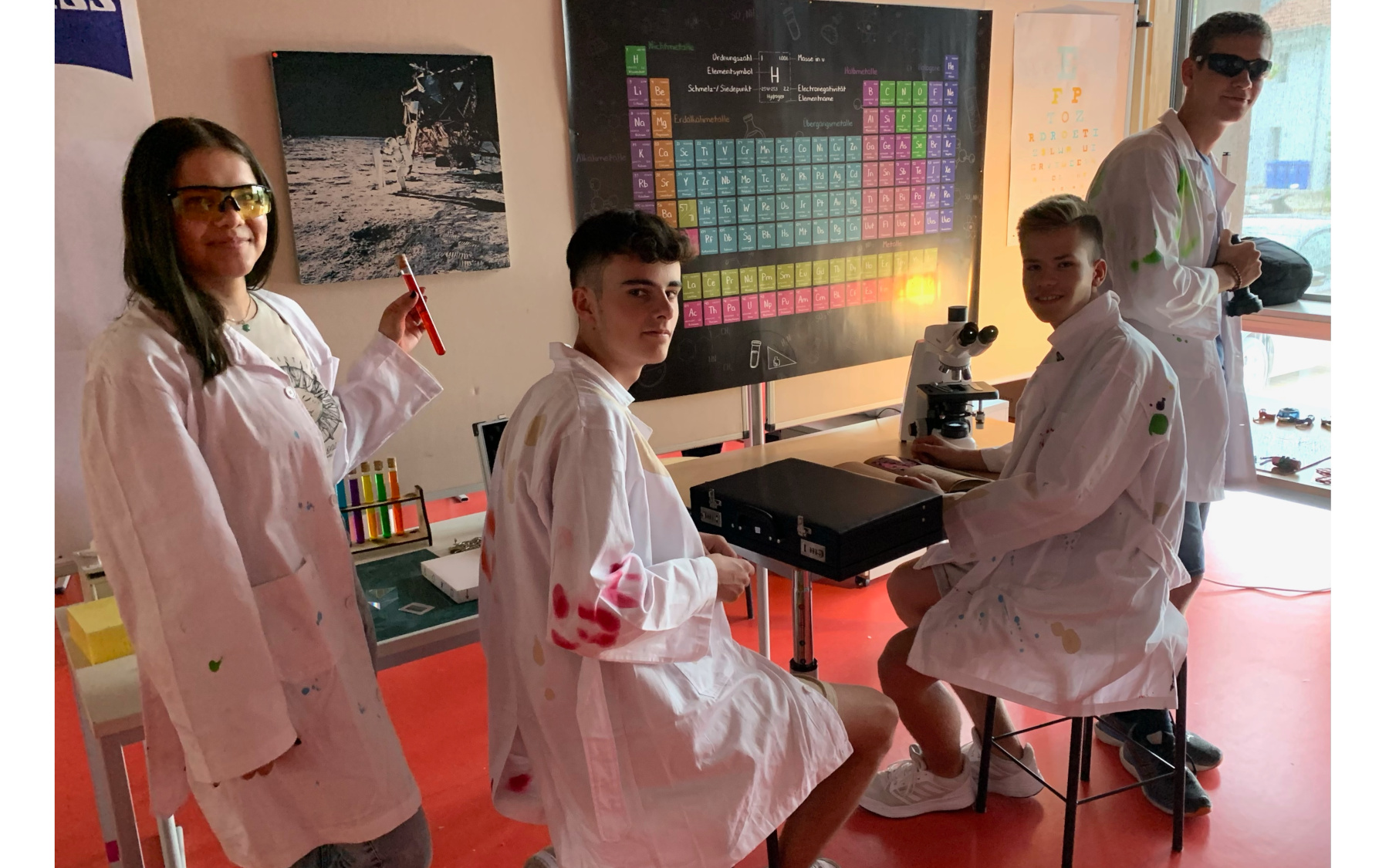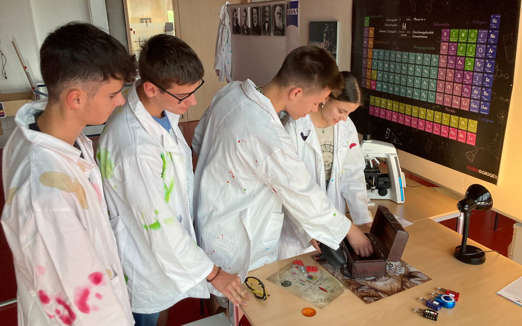 Die Schülerinnen und Schüler erhielten die Aufgabe, die streng gesicherte Truhe eines weltbekannten, unter unerklärlichen Umständen verschwundenen Professors zu öffnen, um seine in der Truhe versteckte, bahnbrechende Erfindung rechtzeitig der Öffentlichkeit zu präsentieren. Um dieses Ziel zu erfüllen, mussten die Teilnehmenden gemeinsam kleine Experimente und Rätsel aus dem Themenbereich Optik lösen. Beim Lösen der Aufgaben lernten sie nebenbei die unterschiedlichen MINT-Bereiche kennen – und deckten zum Schluss das Geheimnis der mysteriösen Erfindung auf. Darüber hinaus begaben sich die THG-Schüler:innen mit einer Mitarbeiterin des Explorhino der Hochschule Aalen auf eine optische Entdeckertour und konnten ihre naturwissenschaftlichen Kenntnisse an ganz praktischen Beispielen der Optik am eigenen Leib austesten. Ein gelungener Vormittag im Schülerforschungslabor in Kooperation mit der Firma ZEISS.