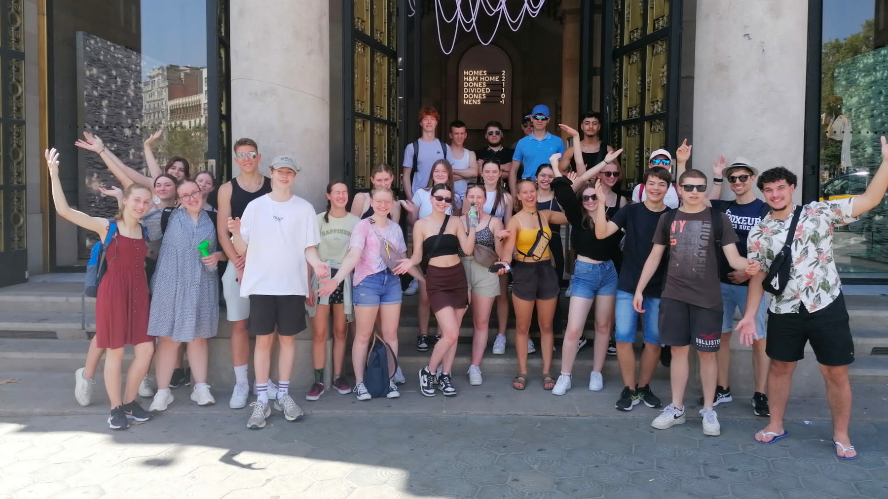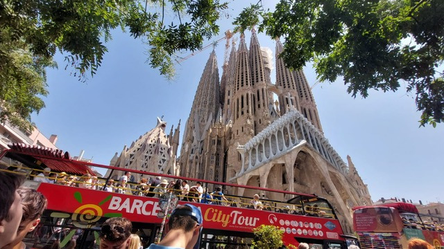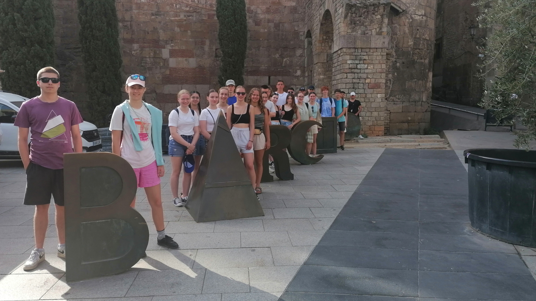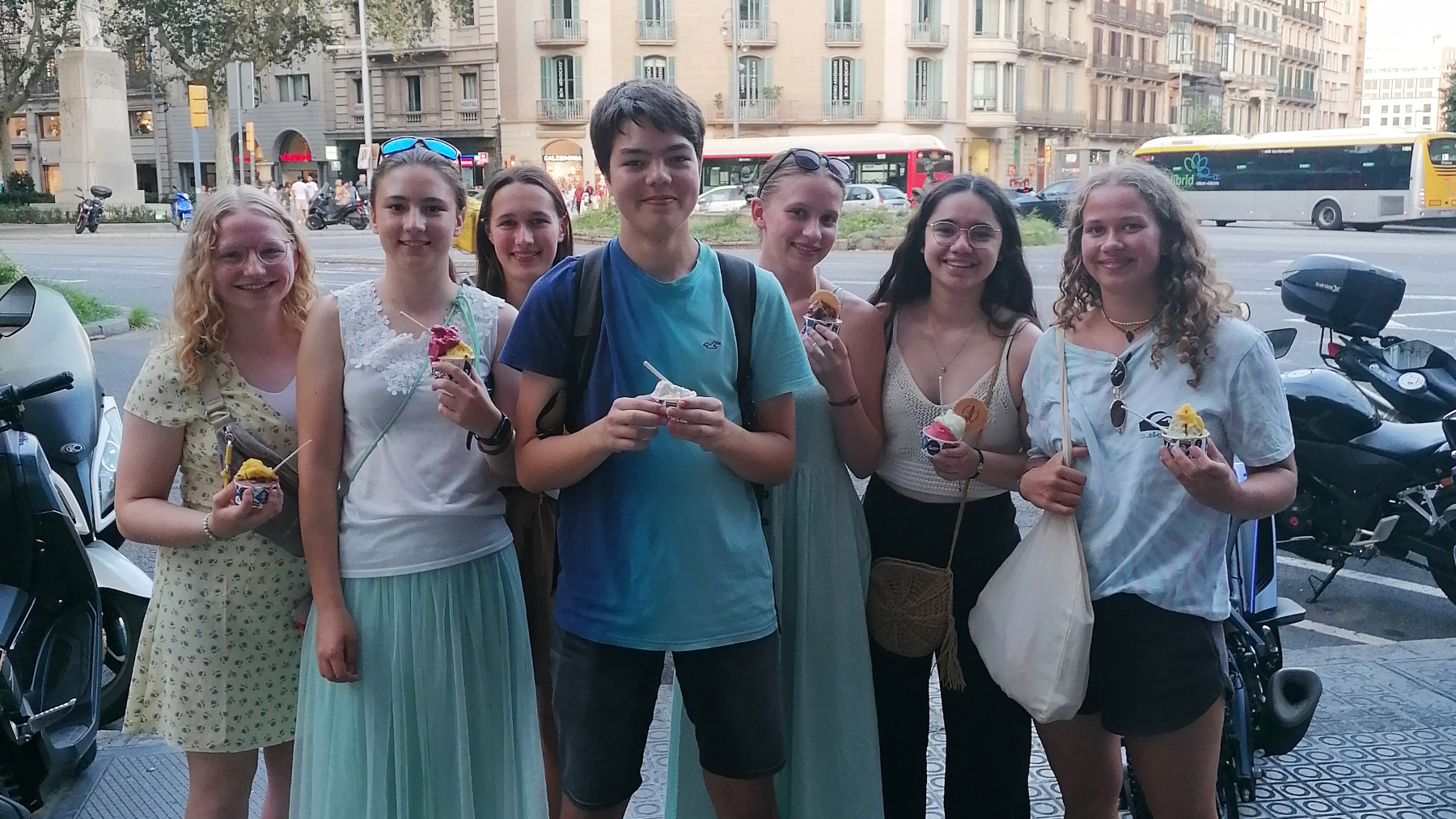 Der nächste Tag begann mit einem Besuch der Boquería, der Markthalle an den Ramblas, wo wir unser Frühstück durch frische Säfte und exotische Früchte erweitern durften. Es folgte ein Ausflug zum Passeig de Gracia und seinen berühmten Gaudí-Häusern, Casa Millà und Casa Batllò und später durfte dann auch die berühmte Sagrada Familia auf dem Programm nicht fehlen, deren Türme bereits jetzt in beeindruckende Höhe ragen. Trotz der Hitze, die wir dank Aquarius – einem Heilmittel gegen jegliche Gebrechen – aushalten konnten, hatten wir Spaß an der Stadtrallye durch das Barrio Gótico und die Ramblas. Die zwei Siegergruppen wurden anschließend gebührend mit einem katalanischen Oskar oder bunten Taschen geehrt. Am nächsten Tag suchten wir dann das nächste Highlight auf: den Parque Güell, in welchem Architektur und Natur wunderbar aufeinander abgestimmt sind. Abends sangen wir (manchmal war es eher ein Jaulen) in einer Karaokebar - von Papaoutai bis zu 1001 Nacht war alles dabei! Als Höhepunkt kann man jedoch „Barbie Girl“ betrachten, den Lehrern sei Dank. Ein Muss am nächsten Tag war natürlich auch das Picasso-Museum. Neben diesen offiziellen Programmpunkten hatten wir auch viel Spaß am eigenständigen Erkunden der Stadt in kleineren Gruppen. Während manche die Meeresnähe am Strand bevorzugten, zog es andere ins Aquarium, auf die Anhöhe Barcelonas, den Tibidabo, zum Hanteltraining in der prallen Hitze oder einfach zum Shoppen in die Innenstadt. Für Misstrauen und Spaß sorgte während des Aufenthaltes außerdem das sogenannte „Mörderspiel“, welches beeindruckend viele (insgesamt sechs Schüler*innen) „überlebt“ haben.