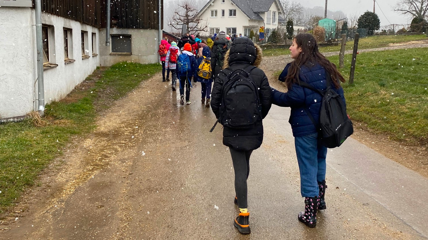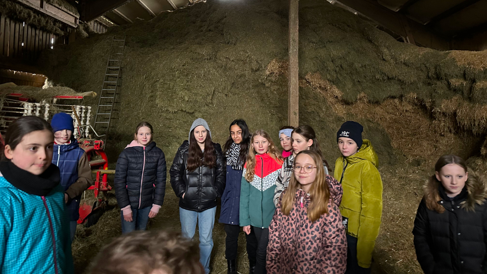 Am Mittwoch besichtigte die Klasse 6c im Rahmen des Erdkundeunterrichts den Bauernhof der Familie Klopfer in Aalen. Der Weg zum Bauernhof wurde bei recht winterlichen Temperaturen zu Fuß bestritten. Nach einer kleinen Stärkung zu Beginn der Erkundung klärte Frau Klopfer die Schüler*innen über den Betriebsspiegel auf. Wie viel Kühe befinden sich auf dem Hof? Wie viel Fläche (Ackerland, Grasland) bewirtschaftet die Familie? Was für ein Fuhrpark steht zur Bewirtschaftung der Flächen zur Verfügung?