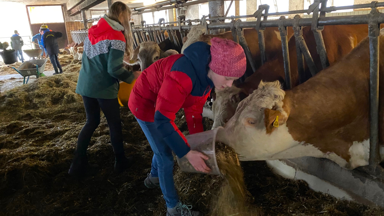 Im Anschluss durften die Schüler*innen im Stall das Futter für eine Kuh selbst zusammenstellen und lernten dabei wie viel Grassilage, Heu, Gerstenschrot und Maissilage eine Kuh täglich frisst.
