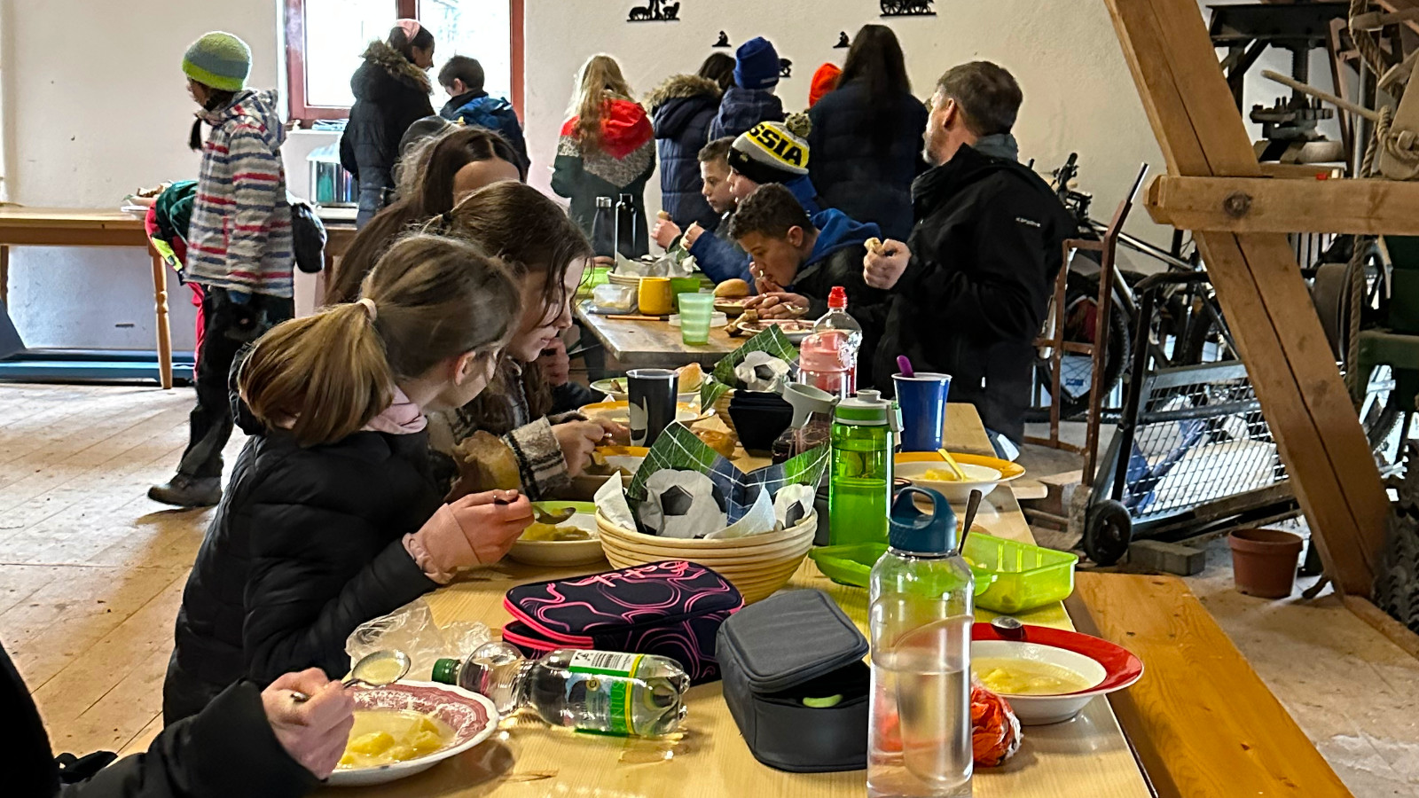 Weitere spannende Erkundungsorte für die Klasse 6c waren die Kälbchen in ihren Iglus, der Maschinenschuppen und der Heuboden. Frau Klopfer sorgte zum Abschluss fürs leibliche Wohl. Es gab für die Schüler*innen eine selbstgemachte Kartoffelsuppe und einen gesponserten Schokodrink der Hohenloher Molkerei eG. Gestärkt und zufrieden traten die Schüler*innen im Anschluss den Rückweg ans THG an.