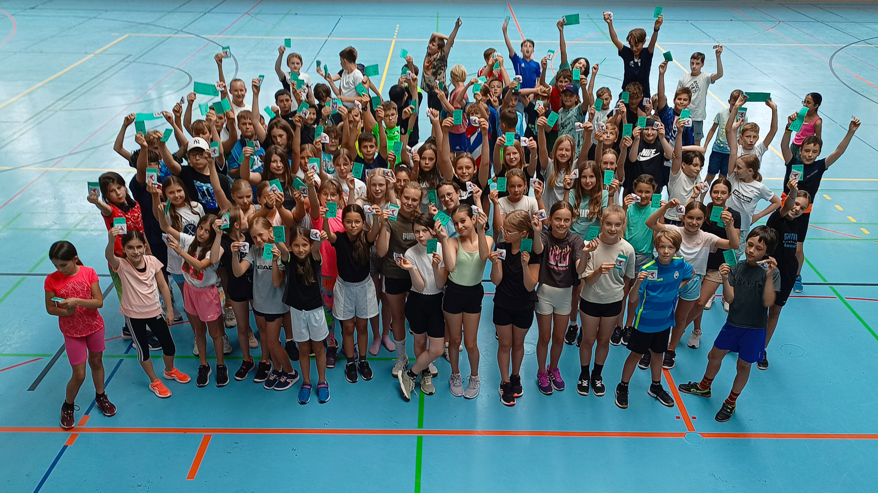 Die Abnahme des Schwimmabzeichens erfolgte während des Schwimmunterrichts, der blockweise über das ganze Schuljahr verteilt ist. Nun wurden die Abzeichen und die Schwimmpässe, die freundlicherweise von den Stadtwerken Aalen gesponsert werden, an die Schülerinnen und Schüler der Klasse 5 übergeben.
