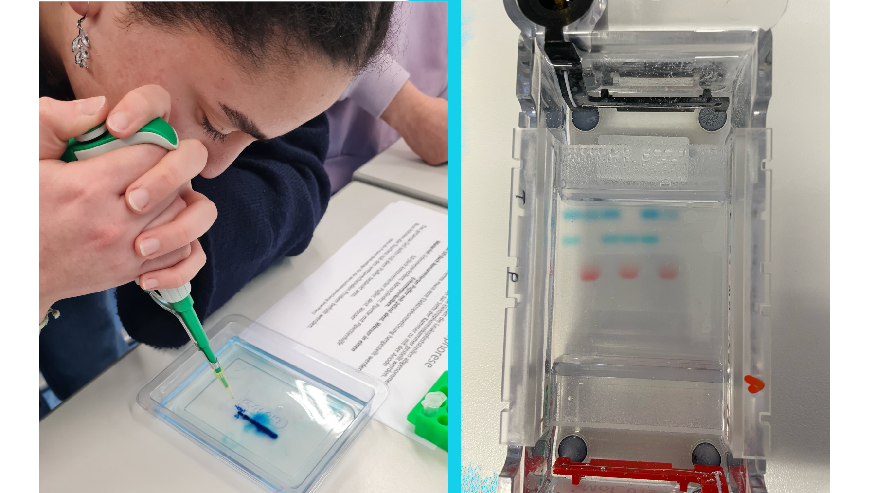Unter Anleitung von Herrn Mang erhielt der Kurs eine theoretische Einführung zur Gelelektrophorese und dessen molekulargenetischer Grundlagen. Danach legten die Schüler selbst Hand an und führten im Praktikum einen Verwandtschaftstest durch. Hierbei war Präzision und ein ruhiges Händchen von Nöten, um die DNA-Proben in die Geltaschen des Agarose-Gels zu pipettieren.