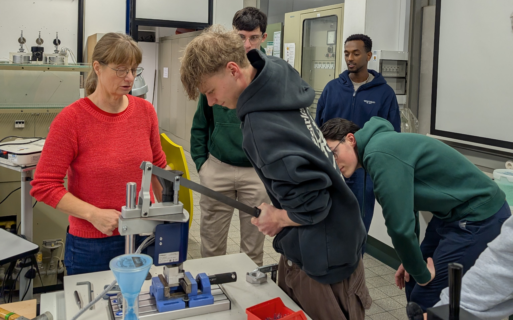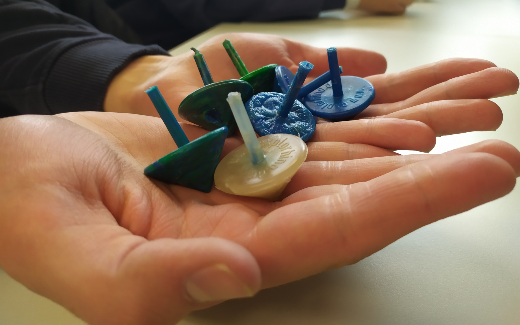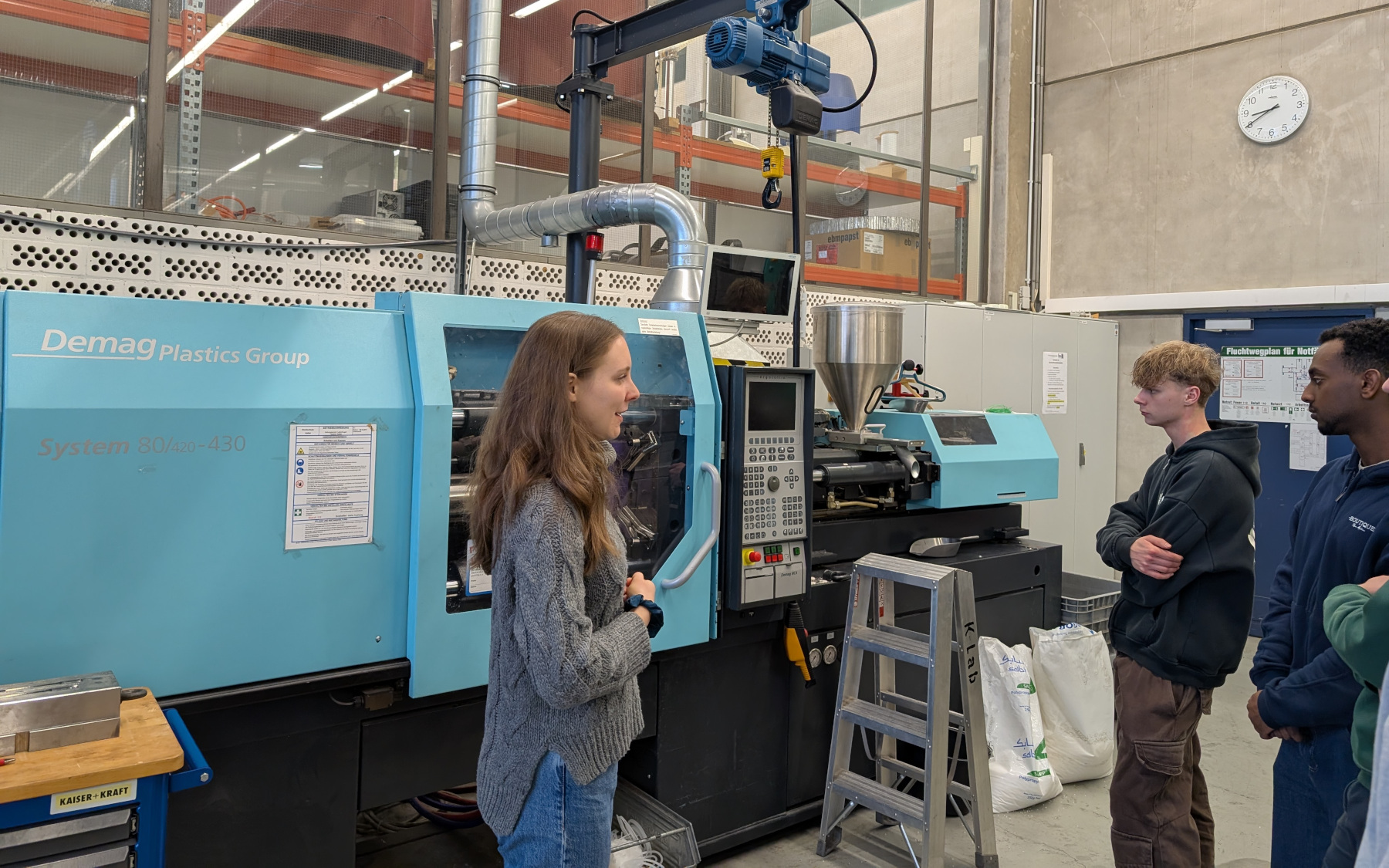 In Kleingruppen wurden verschiedene Verpackungsmaterialien wie Joghurtbecher, Folien und Waschmittelflaschen aus dem Gelben Sack mittels Nahinfrarotspektroskopie nach Kunststoffsorten (PP, PS, PE) sortiert. Anschließend durften die Schülerinnen und Schüler Deckel von PET-Flaschen schreddern und mit einer ordentlichen Portion Muskelkraft in einer handbetriebenen Spritzgussmaschine zu Kreiseln umformen. Im Kunststoff-Labor ging es anschließend noch um die Frage, wie denn Joghurtbecher, Chipstüten und Kugelschreiber industriell gefertigt werden. Hierbei wurden u.a. eine Spritzgussmaschine sowie verschiedenste Extruder und 3D-Drucker besichtigt, aber auch kritisch über die Vor- und Nachteile der Verwendung von Kunststoffen im Alltag diskutiert.