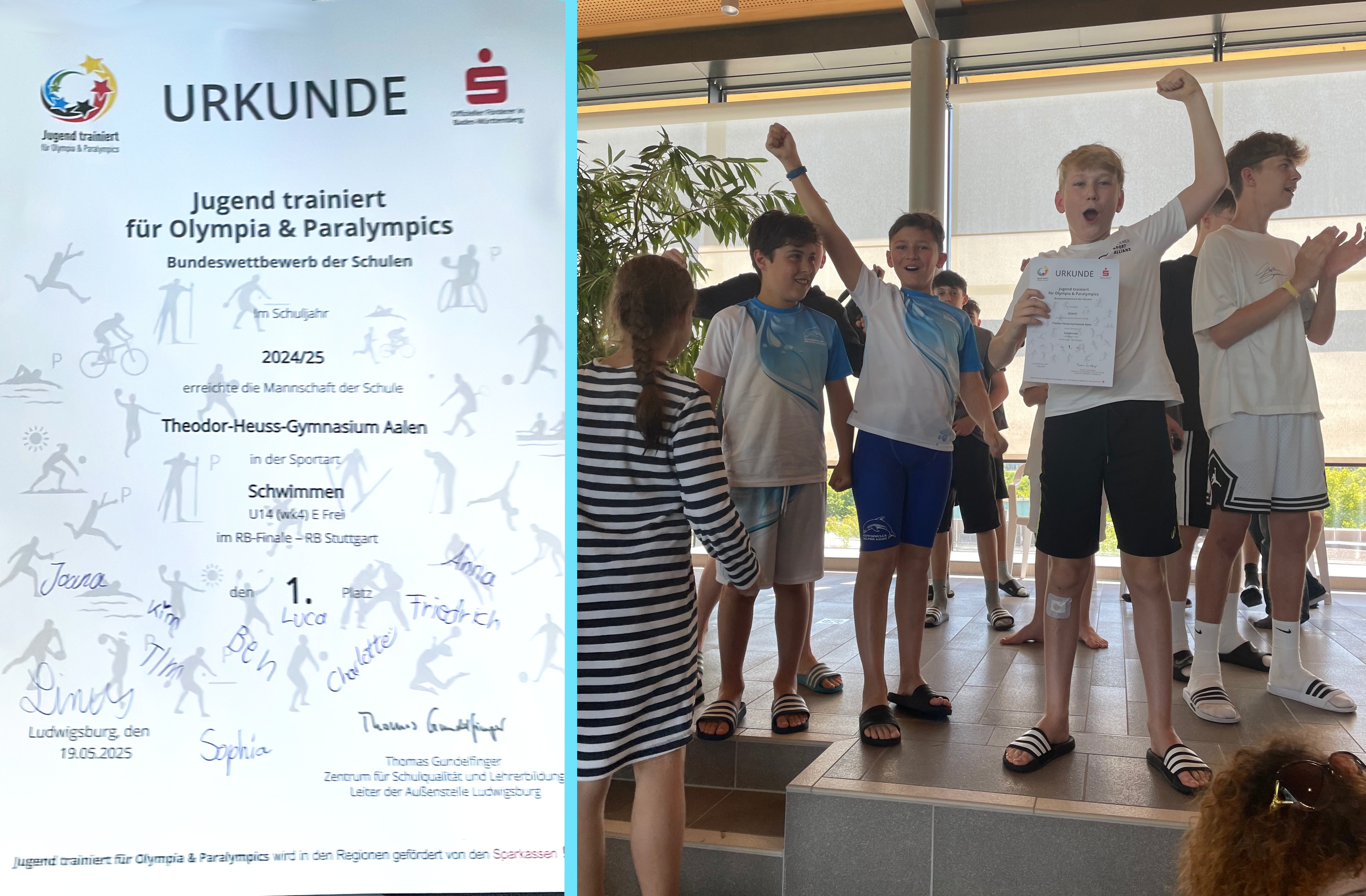 Am Montag, dem 19. Mai 2025, fand das Finale des Regierungspräsidiums Stuttgart von „Jugend trainiert für Olympia“ (JtfO) Schwimmen im „Aquatoll“ in Neckarsulm statt. Das neunköpfige Team aus Schülerinnen und Schülern der Klassenstufe 5 bis 7 des Theodor-Heuss-Gymnasiums konnte hier zum zweiten Mal den Sieg mit nach Hause nehmen.