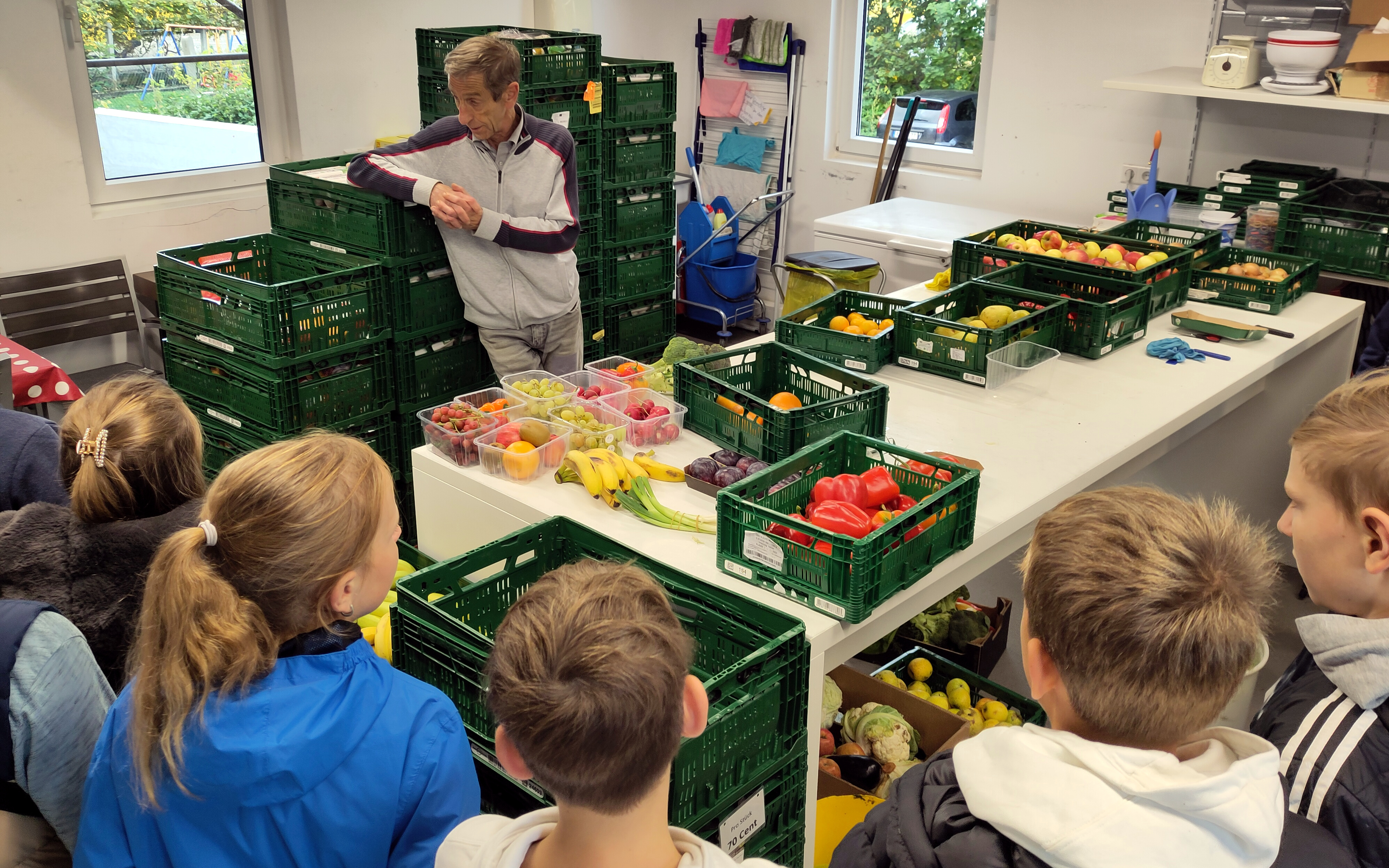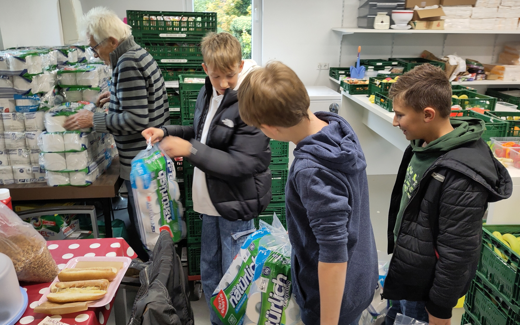 Am Donnerstag, den 10.10.24, stattete eine Religionsgruppe der Klassenstufe 6 im Rahmen des Erntedankfestes dem Kocherladen einen Kurzbesuch ab. Es ging durch die Hintertür in den Warenraum, wo der Leiter der Aalener Tafel, Herr Vietz, den Schüler:innen anschaulich ihre Fragen beantwortete.