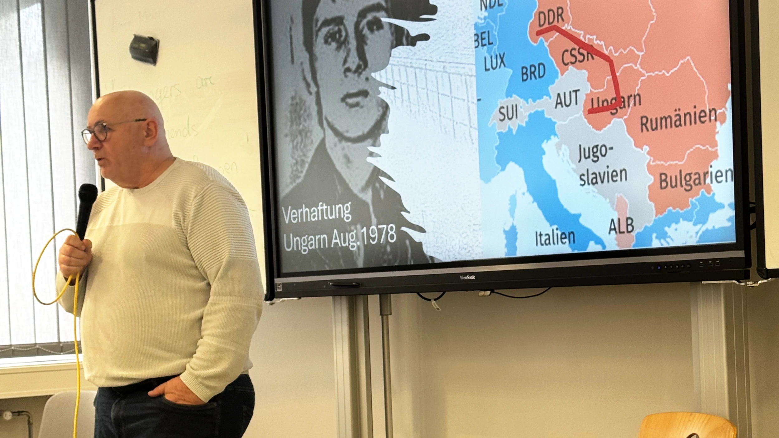 Das Zitat des Namensgebers unserer Schule, Theodor Heuss, stellte der Zeitzeuge Jörg Zenkner in den Mittelpunkt seines Berichts, wie er als Jugendlicher in der DDR in Schwierigkeiten kam und verhaftet wurde, den er am Tag des Erinnerns und Gedenkens, den das Theodor-Heuss-Gymnasium am 28.01.2026 veranstaltete, vor dem 11 Jahrgang hielt.