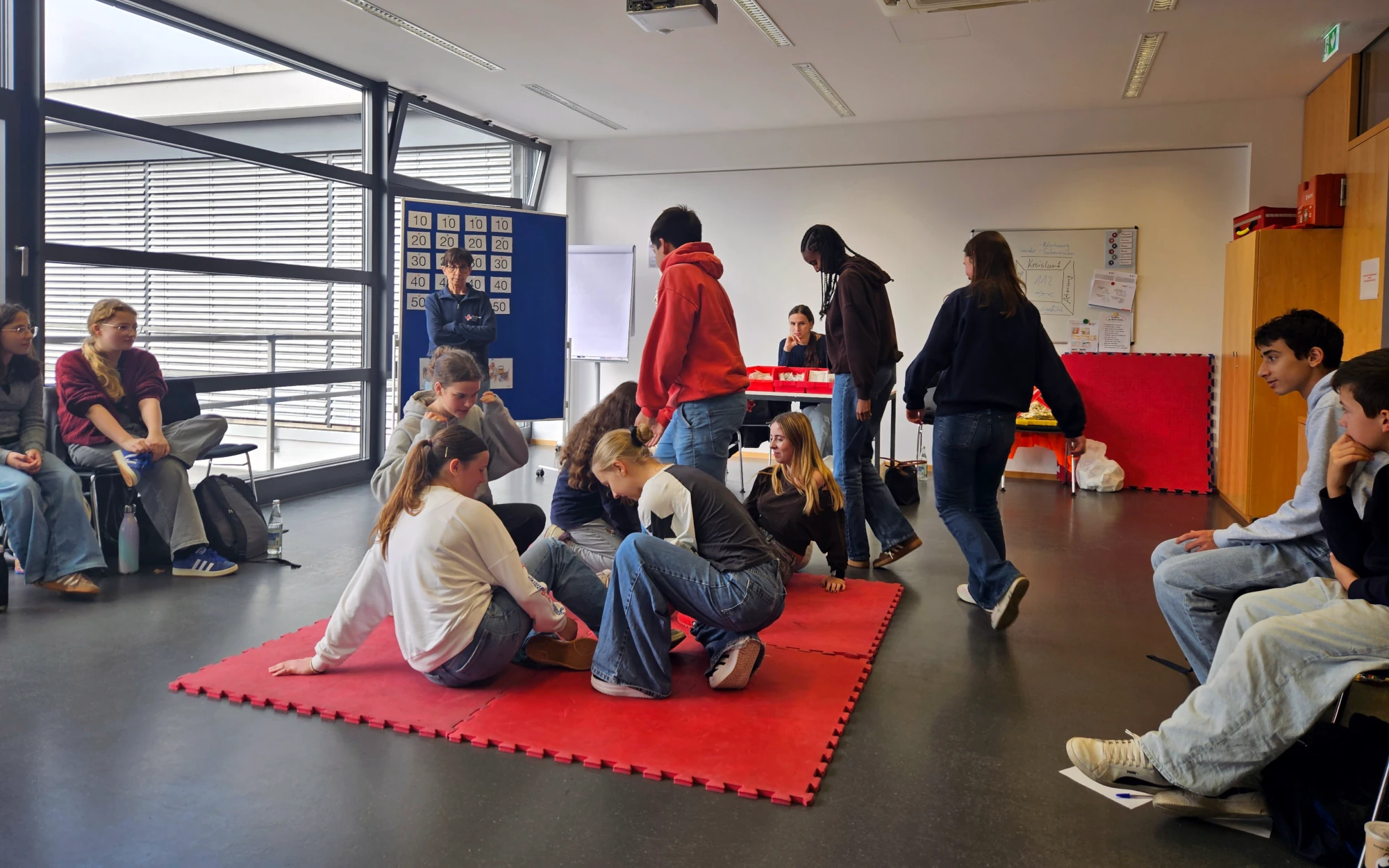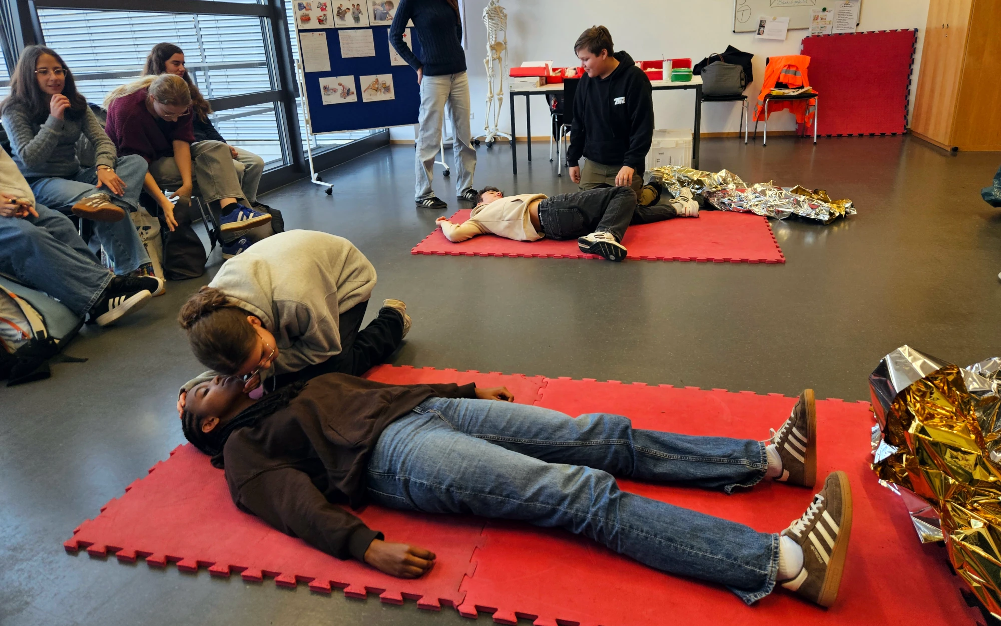 Vor den Herbstferien absolvierte unsere Schulsanitäter-AG einen spannenden Erste-Hilfe-Kurs beim DRK in Aalen. Unter der Leitung von Frau Frädrich wurden zunächst die Grundlagen der Ersten Hilfe, wie z.B. der geregelte Ablauf einer Hilfeleistung (Hilfe holen/Notruf absetzen – Ermutigen/Trösten – lebenswichtige Funktionen prüfen – Decke unterlegen/zudecken, kurz „HELD“) aufgefrischt. Anschließend wurden die Schülerinnen und Schüler gezielt auf mögliche Notfallsituationen im Schulalltag vorzubereitet. Dabei stand nicht nur Theorie auf dem Programm, sondern vor allem das praktische Üben: stabile Seitenlage, Druckverband anlegen, Notruf absetzen und vieles mehr. Besonders viel Spaß brachten die Erste-Hilfe-Spiele, zum Beispiel ein Memory, bei dem Symptome den passenden Erkrankungen zugeordnet werden mussten und zahlreiche Fallbeispiel