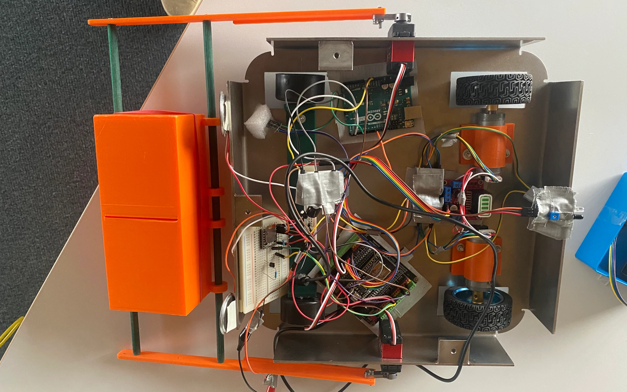 Zu Beginn des Projekts beschäftigte sich das Team mit den Grundlagen der Robotik, der Objekt- und Hinderniserkennung sowie mit unterschiedlichen Greifprinzipien. Darauf aufbauend entstanden erste Konzepte, Entwurfszeichnungen und Funktionsschemata. Die Schülerinnen und Schüler wählten passende Sensoren, Motoren und elektronische Komponenten aus und planten die Mechanik des Greifarms ebenso sorgfältig wie das Fahrwerk des Roboters.