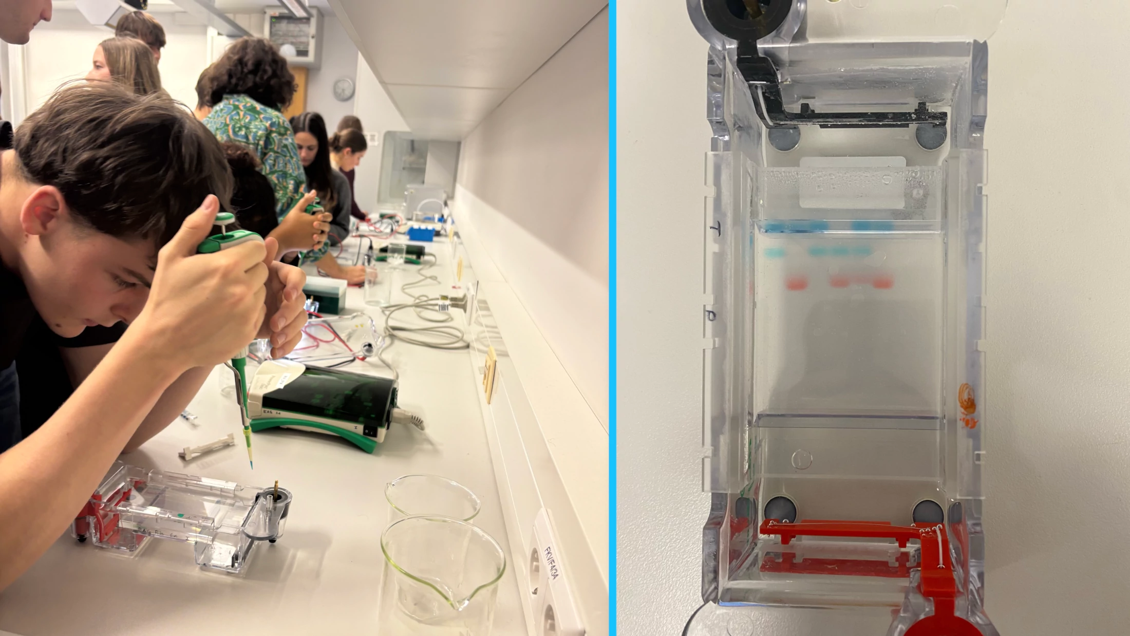 Unter der fachkundigen Anleitung von Peter Mang, Lehrer für Biologie, Chemie und NwT am EAG, führten die Schülerinnen und Schüler eine Gelelektrophorese durch. Zunächst wurde ein Agarosegel gegossen und vorbereitet. Danach pipettierten die Lernenden verschiedene forensische DNA-Proben in die Geltaschen. Durch das Anlegen einer elektrischen Spannung wanderten die DNA-Fragmente unterschiedlich weit durch das Gel. Weiter zum Bericht.