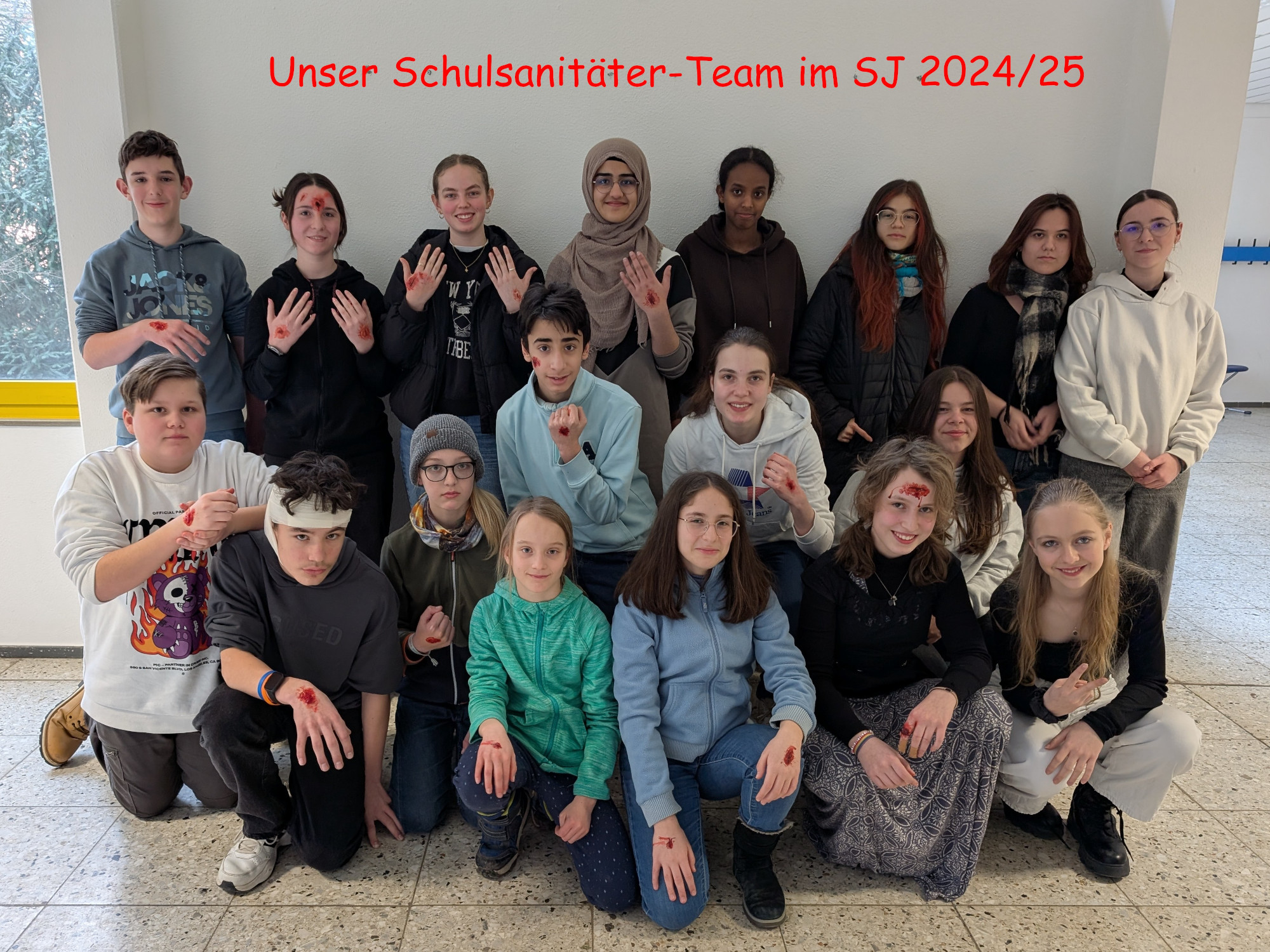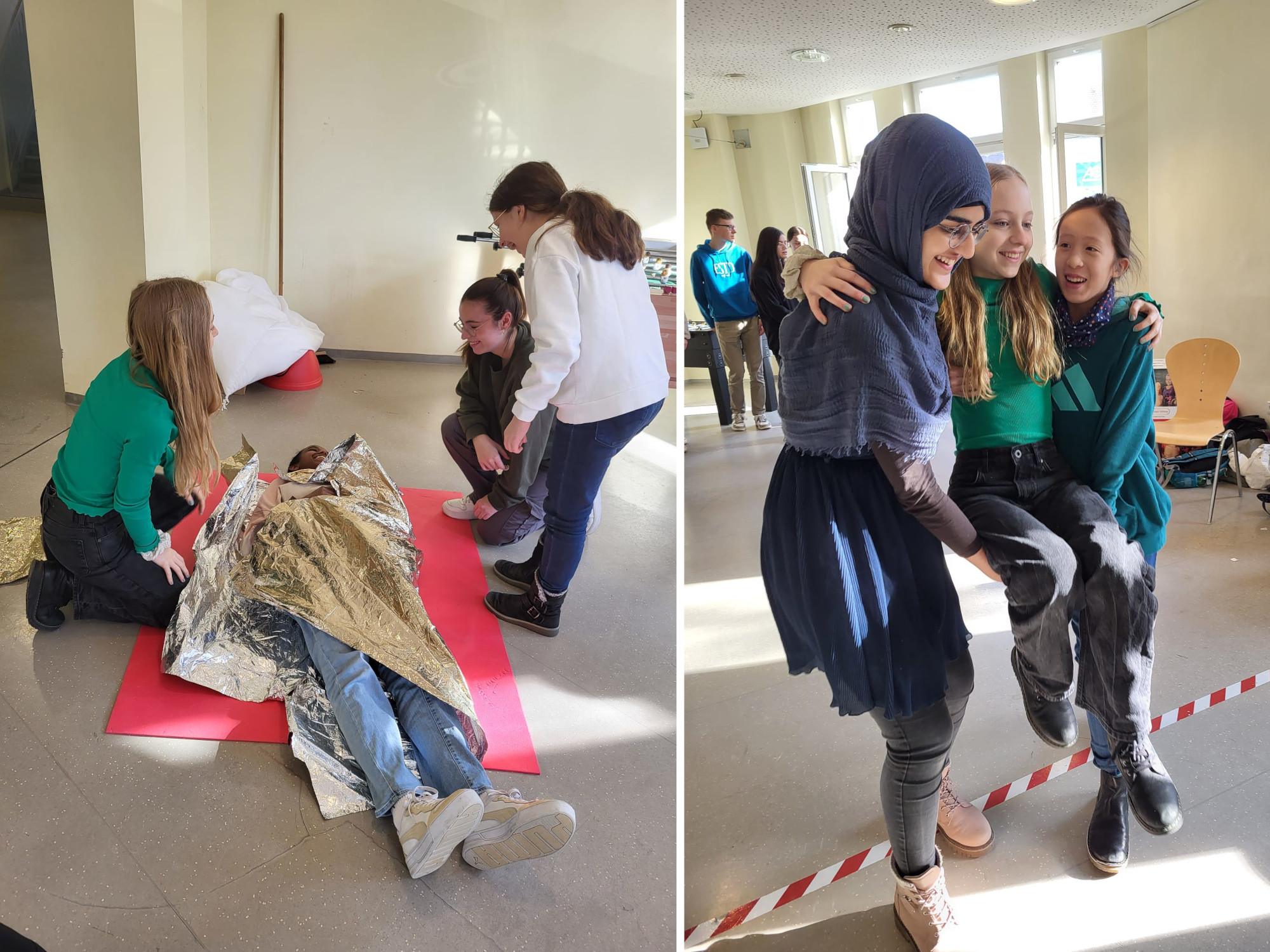Die "Junior-Sanitäter" (Klasse 5-7) erlernen die Grundlagen der Ersten Hilfe und werden mit praktischen Übungen und kleinen Rollenspielen auf den verantwortungsvollen Einsatz als Ersthelfer vorbereitet.