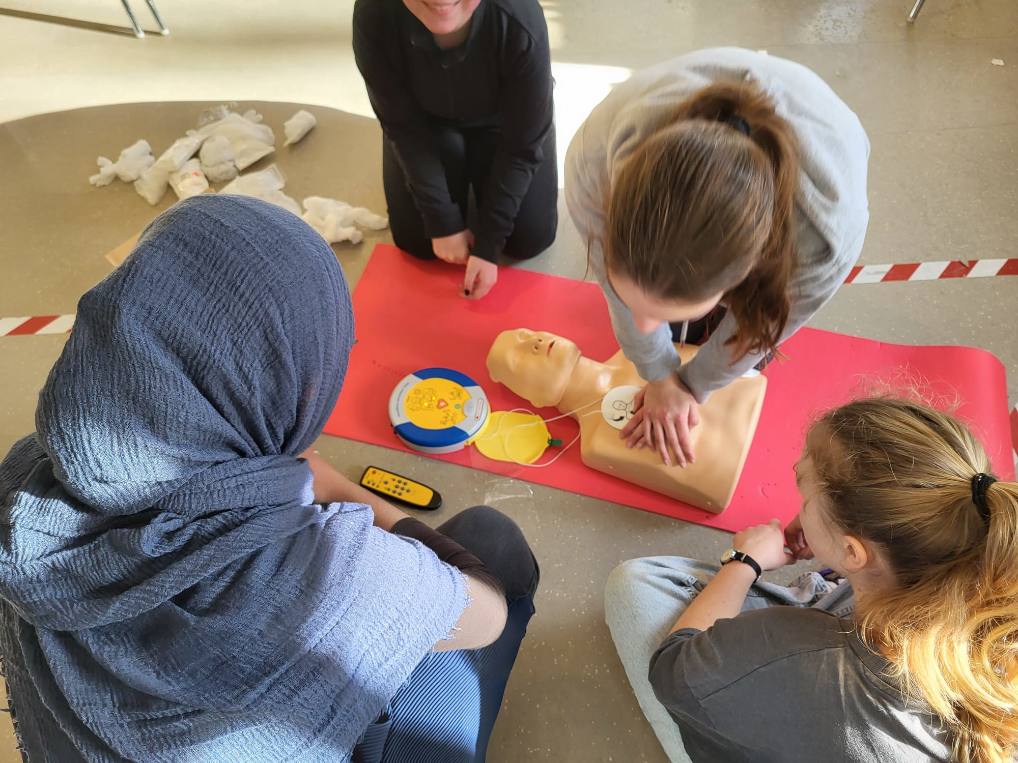 Die Schulsanitäter ab der 8. Klasse absolvieren einmal jährlich einen Erste-Hilfe-Kurs (Kompaktkurs außerhalb der AG-Zeit). In den AG-Treffen wird das erworbene Wissen mit Übungen und kurzen Theorie-Einheiten aufgefrischt. Dieses Wissen und Können kommt dann im Bereitschaftsdienst zum Einsatz. Jeweils zwei Schüler*innen haben eine Woche lang Bereitschaft und versorgen eigenverantwortlich mit Unterstützung durch Frau Ehret und Frau Remppis verletzte Schüler*innen. Erfahrene Junior-Sanitäter dürfen hierbei als Praktikanten mitmachen und bereits erste Einsatz-Erfahrung sammeln.